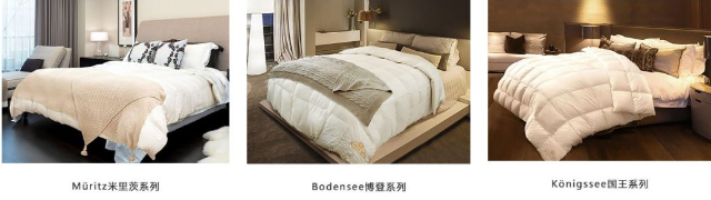 OBB ROYAL BED鹅绒被产品系列,包括冬被——维尔茨、米里茨Müritz、艾博、博登Bodensee、国王Königssee五个系列;黑科技款——Climasphere冬夏两用被;以及夏被——茵梦Chiemsee、艾博Eibsee两款体感轻盈的空调被;鹅绒枕——多瑙Donau、莱茵Rhein两个系列的枕头。